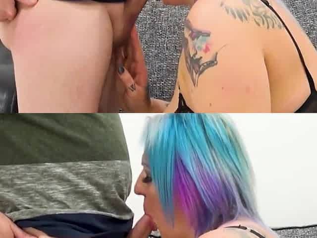Miss Poison fucks the cum out of a chubby chasers cock and swallows