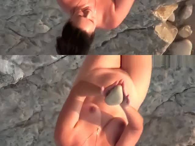 Nude couple in rocky beach taking pictures