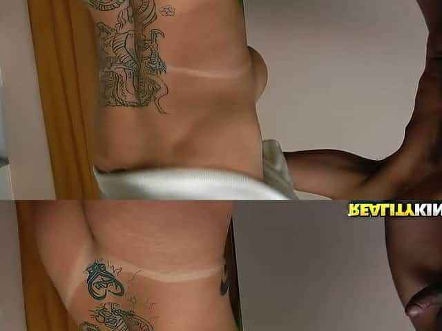 Tattooed harlot guzzles stiff dick and gets her anus rimmed