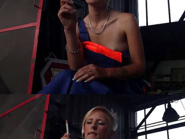 Sensual smoking cigarette blowjob from topless sexy blonde