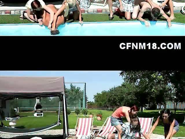 Charismatic cougar with juicy jugs has poolside sex with young vixen