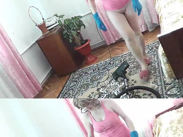 Cleaning the room again! splattered the floor with pussy juice