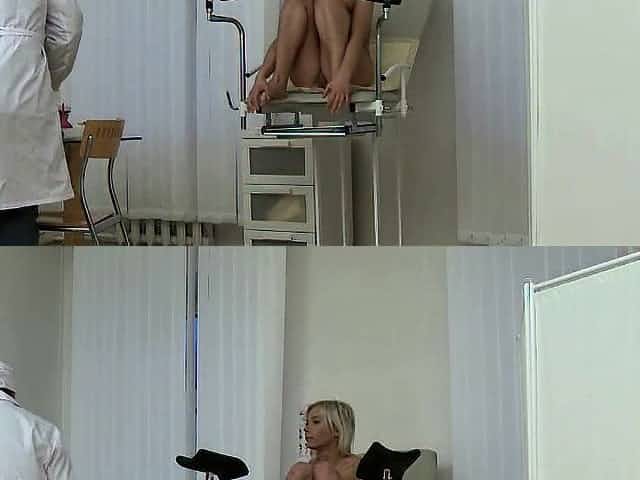 A blonde is in the hospital exam room, getting her wet cunt fingered