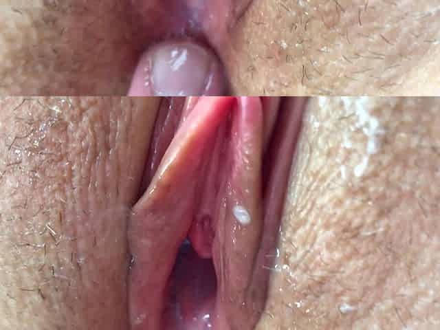Clit Masturbation with Dick. Pussy Fuck. Cum Inside of the Vagina. Creampie and Fisting. Female Orgasm. Close-up.