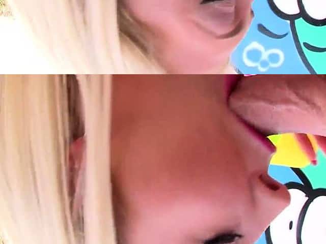 Blonde sweetie rubs her clit and blows massive black dick