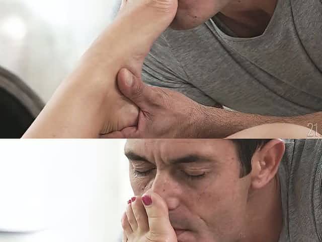 After giving Rocco a blowjob lusty Alecia Fox gets her soles sucked