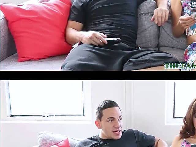 Guy fucks stepmom and her daughter putting their doggy on the couch