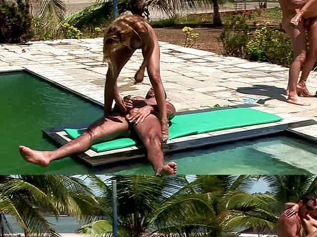 Cum sharing, cum swallow, and creampies: A group sex by the pool