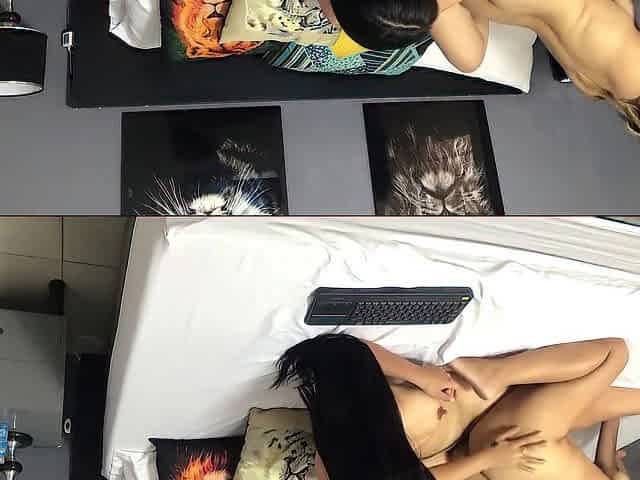My Latin girlfriend fucks me well in a scissor pose, until I put a huge dildo in her