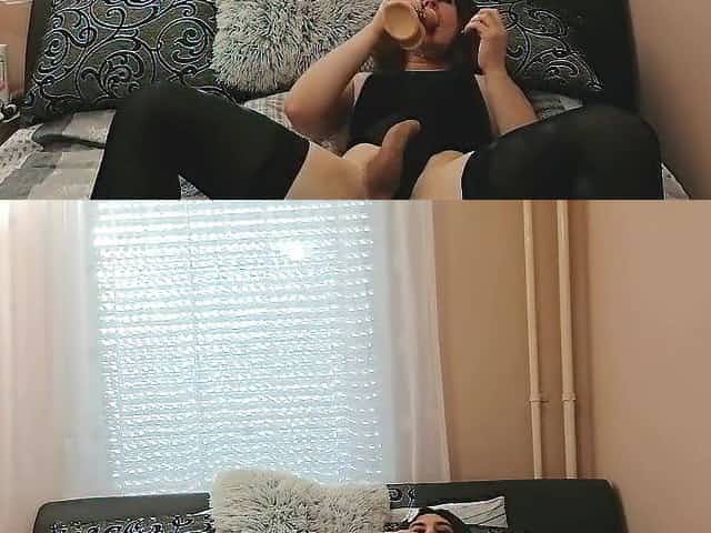 Sissy crossdresser female masker swallowing massive load of cum