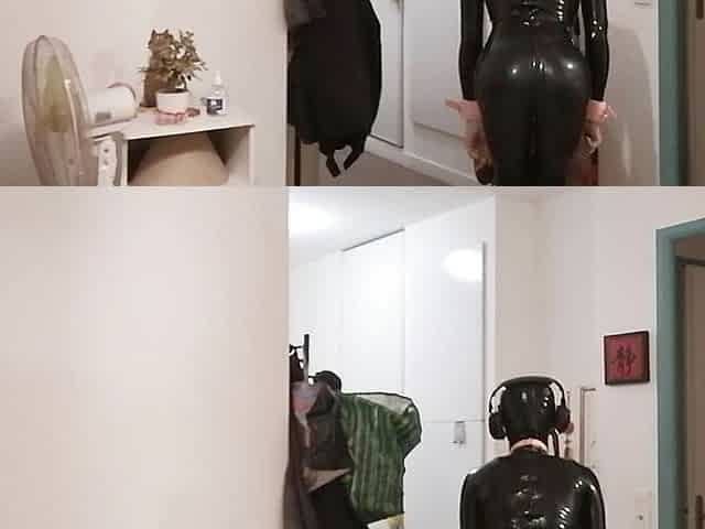 Latex mask and crossdresser enema