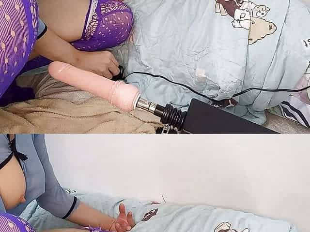 Crossdressing sissy playing with Sex machine