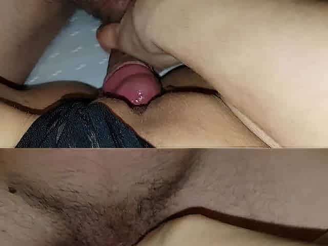 rubs her bald cunt on the knob and gets a massive jizz flow on her pants..PUSSYJOB