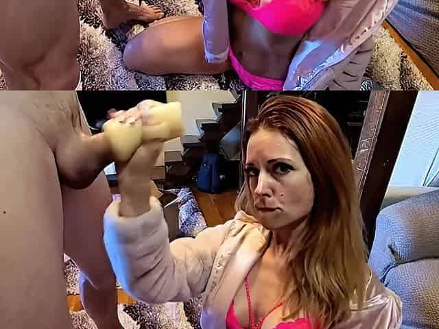 Stepmom handjob dick milking semen .