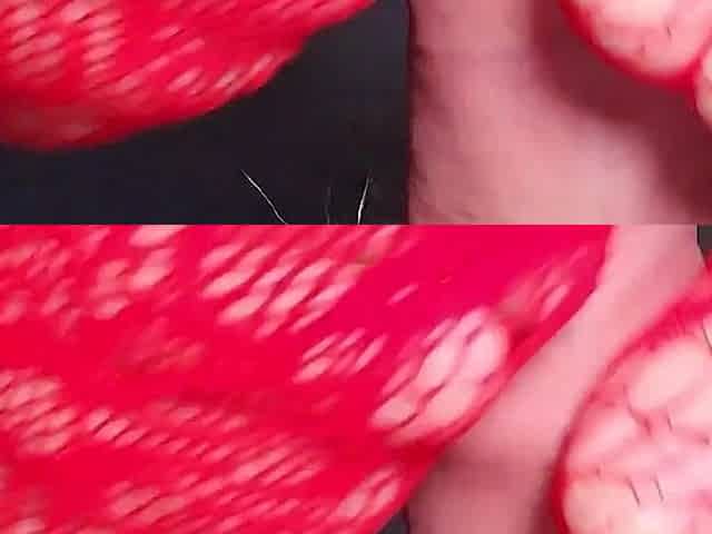 Footjob by Chubby in Red Lace Stockings and Black Panties