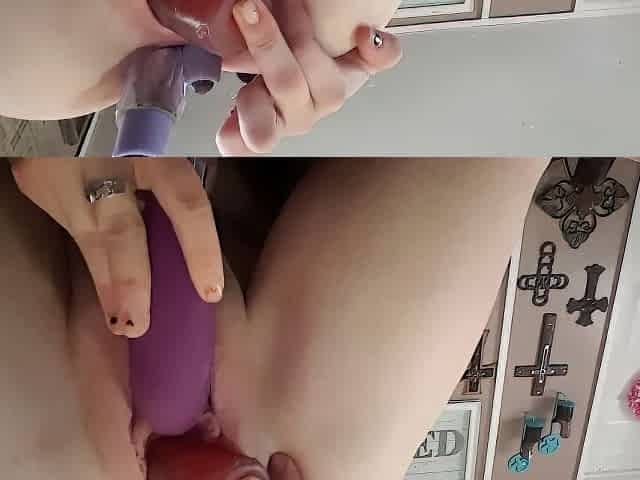 Slut fingers her extremely tight pussy & sucks on her tits LOUD MOANING!!