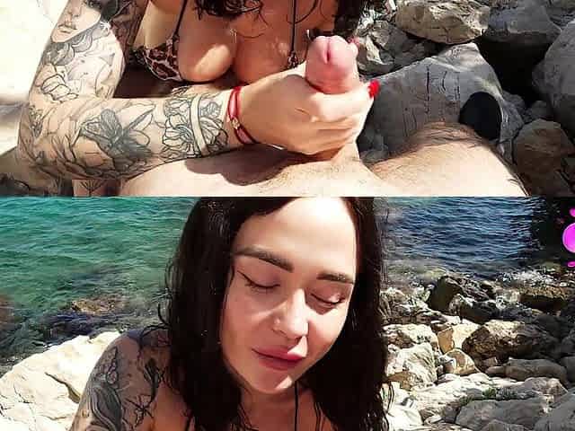 Risky beach bang after sloppy oral — overspread Her boobs in cum