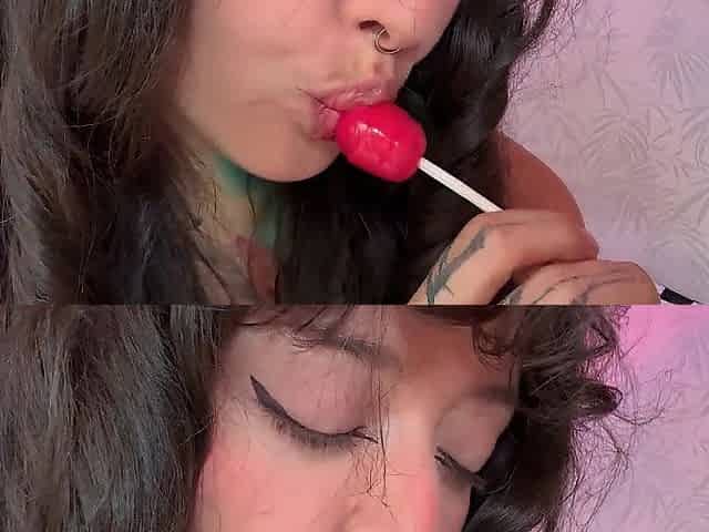 Girl with split tongue licks a lollipop and puts in ass