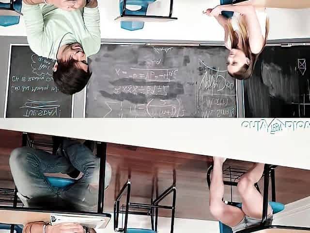 Gorgeous curly-haired babe is enjoying sucking in the classroom