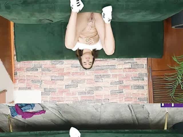 Cute brunette doll is riding stepbrother's willy on the couch