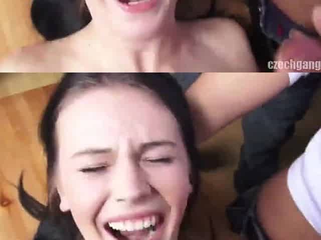 Hot young brunette babe enjoys gangbang orgy with cum on face