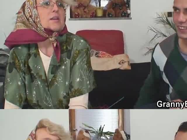 Teen boys fuck old blonde granny from both sides