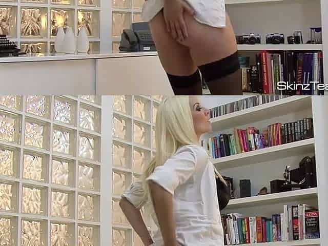 Sexy brunette hair hottie singing and dancing with stripped butt at work