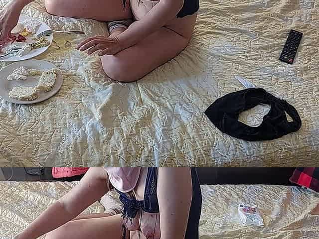 Horny wife enjoys breakfast in bed with her furry poon and thick tits
