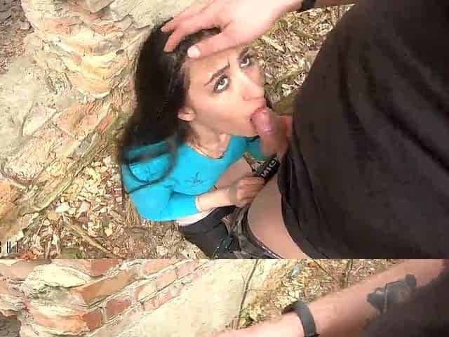 Skinny Brunette hair Olyssia Sucks A Hard Penis And Gets Jizzed!