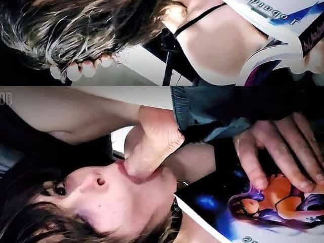 Dark-haired teen with big tits gives a POV blowjob to his little dick