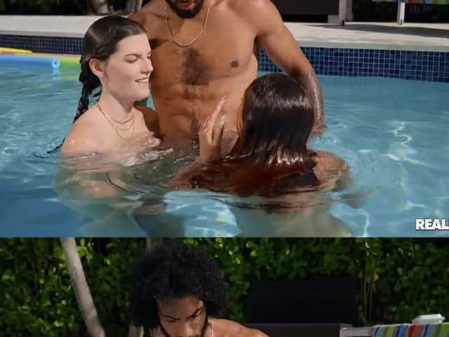 Horny black dude fucks two mischievous babes by the pool