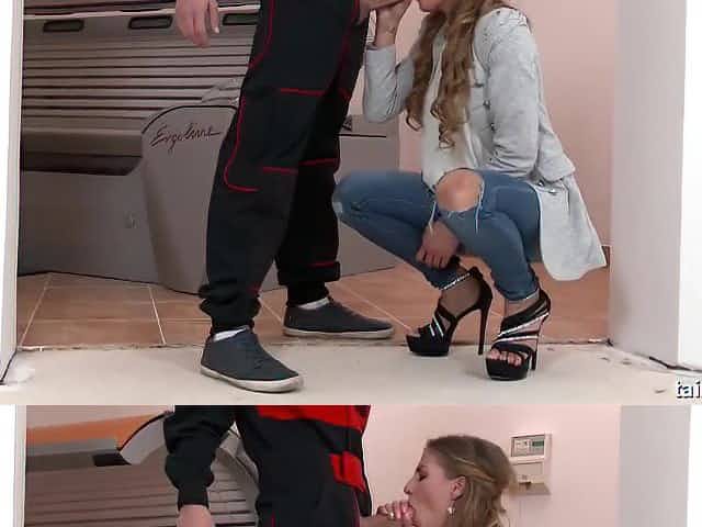 Charming teen brunette Eveline Dellai worship huge penis of her new boyfriend