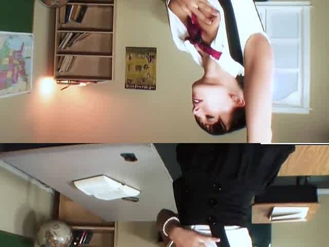 Take a peak under College Girl desk and look at her shoeplay
