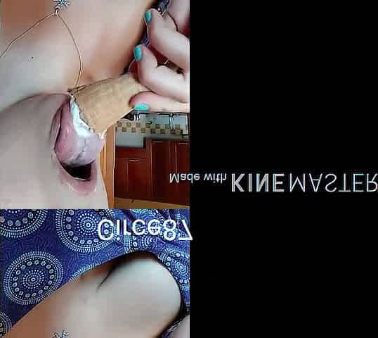 Ragazza Italiana lecca mangia gusta cono gelato gioca con la lingua e panna