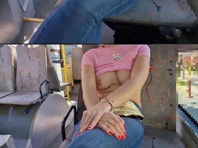 Stepdad jerks off on public bus, I flash my boobs and stroke his dick