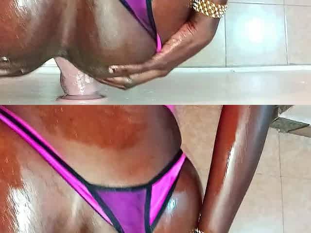Large penis on the wall screws my lewd juicy cunt to climax in doggystyle.