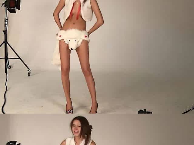 In white pants doing 2 hot poses, cowgirl and doggy position