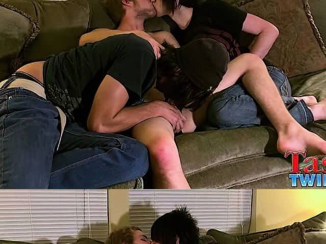 Smooth twink double teamed by his cute lovers until he cums