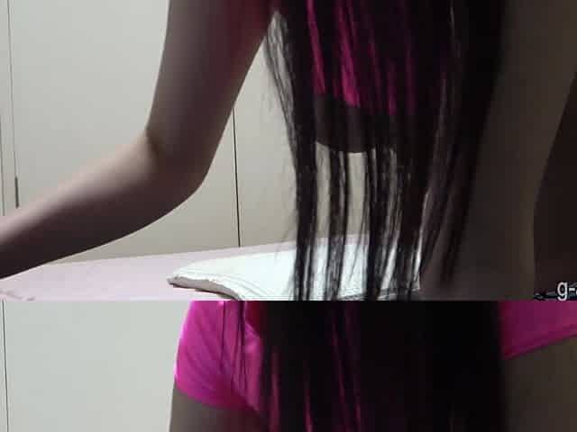 downblouse video of Kim cleaning