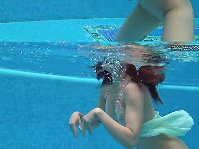 Breath taking underwater show featuring sexy babe in dress