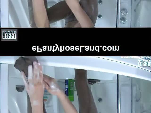 Freakish babe takes a shower fully clothed wetting and lathering her tights