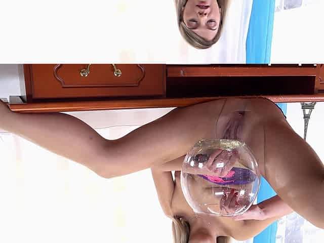 Horny blonde babe Sandra Bell peeing on a table and masturbating