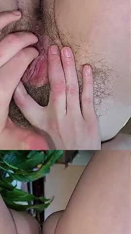 Wife rubbing her wet hairy pussy to orgasm with contractions