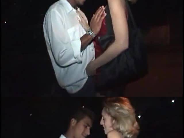 Blonde babe gives well-hung lad access to her holes outdoors