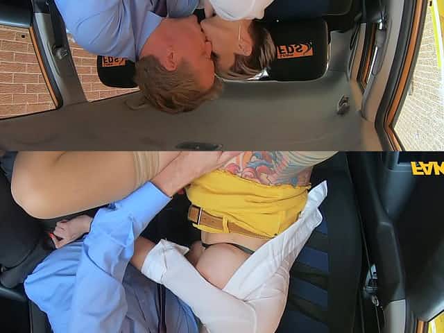 Fake Driving School Backseat Threesome with Big Tits