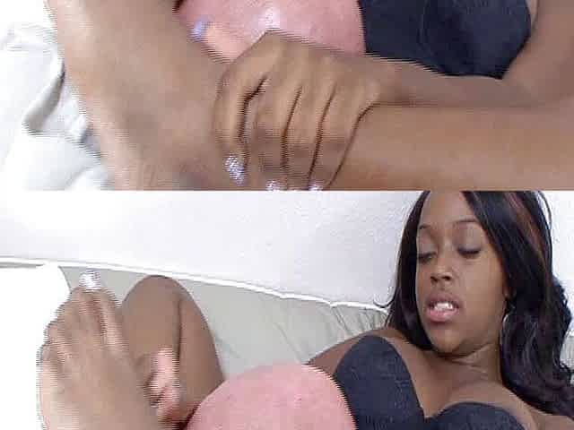 Sexy ebony angel gives footjob to a sex-toy