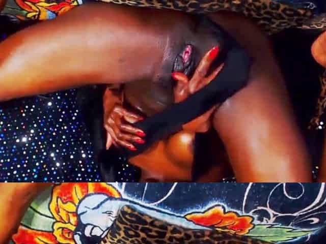 Black domme with large titties shows vagina