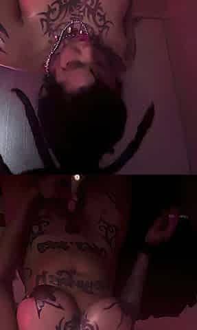 Inked Ebony shemale babe fucked chubby guy in his ass with her BBC and dildo