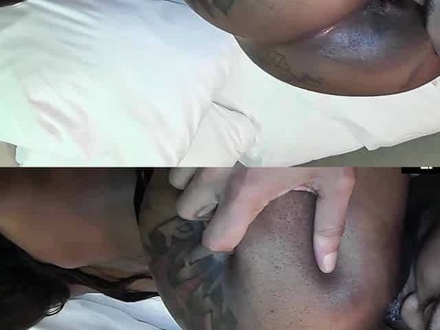 Totally Naked Chocolate Cutie Serves Two White Cocks