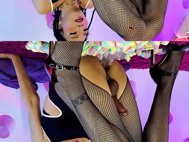 Redhead ladyboy in ebony costume strokes her curly knob untill giant spunk fountain